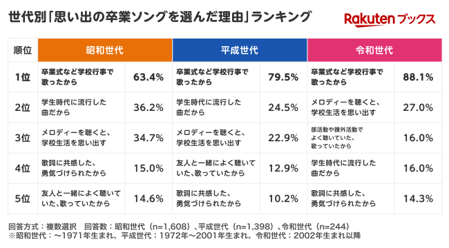 楽天グループ株式会社が運営するオンライン書店「楽天ブックス」は、3月の卒業シーズンに向けて、「楽天ブックス」ユーザー3,248名を対象としたアンケートを実施し、その結果をもとに「世代別 思い出の卒業ソングランキング2026」を本日発表しました。